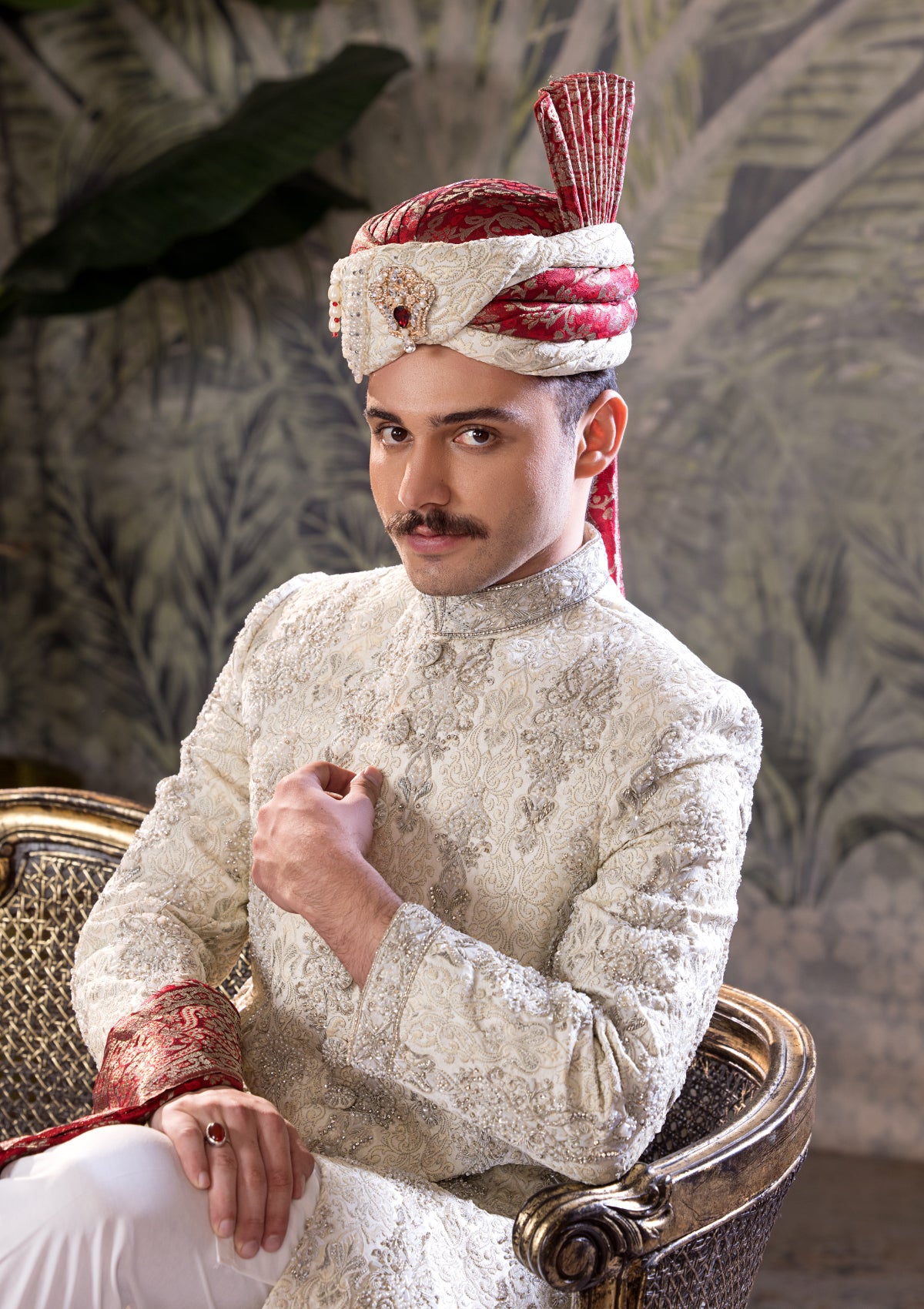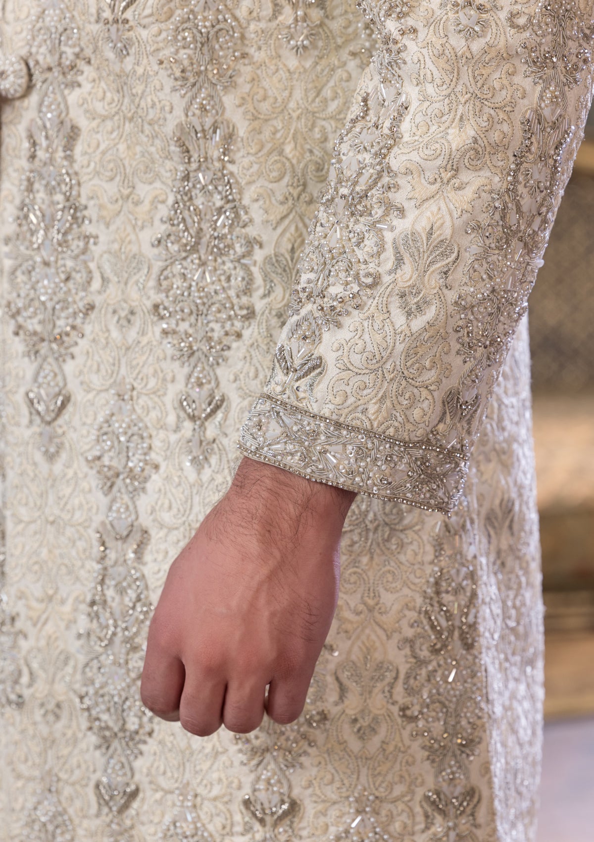 HAND EMBROIDERED SHERWANI , EMBROIDERED FABRIC ,DIFFERENT TONES OF SILK THREAD & CLASSIC EMBROIDERY TECHNIQUES