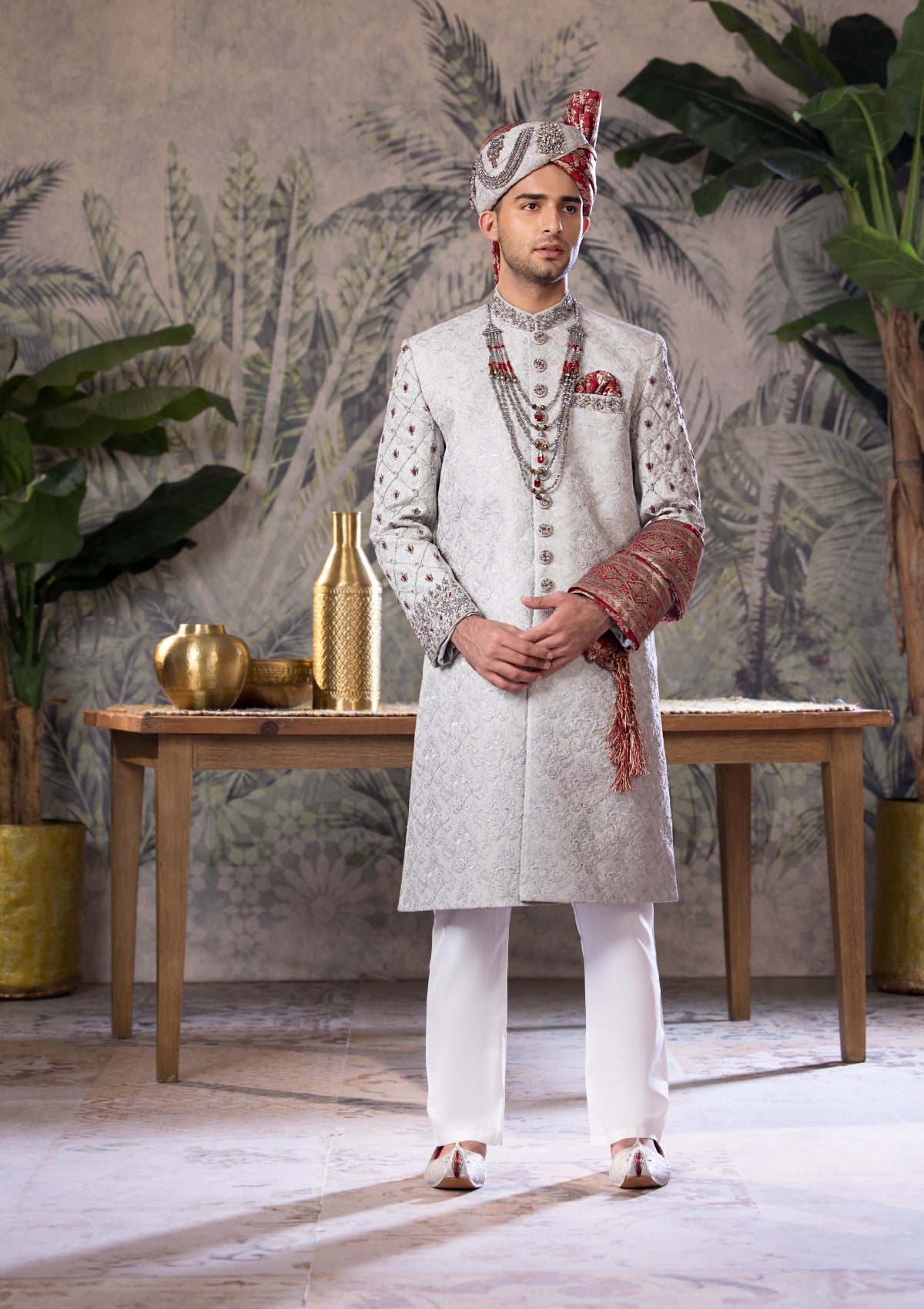 HAND EMBROIDERED SHERWANI , EMBROIDERED FABRIC ,DIFFERENT TONES OF SILK THREAD & CLASSIC EMBROIDERY TECHNIQUES INCLUDED QULLA KHUSSA & MALLA IN THIS PRICE