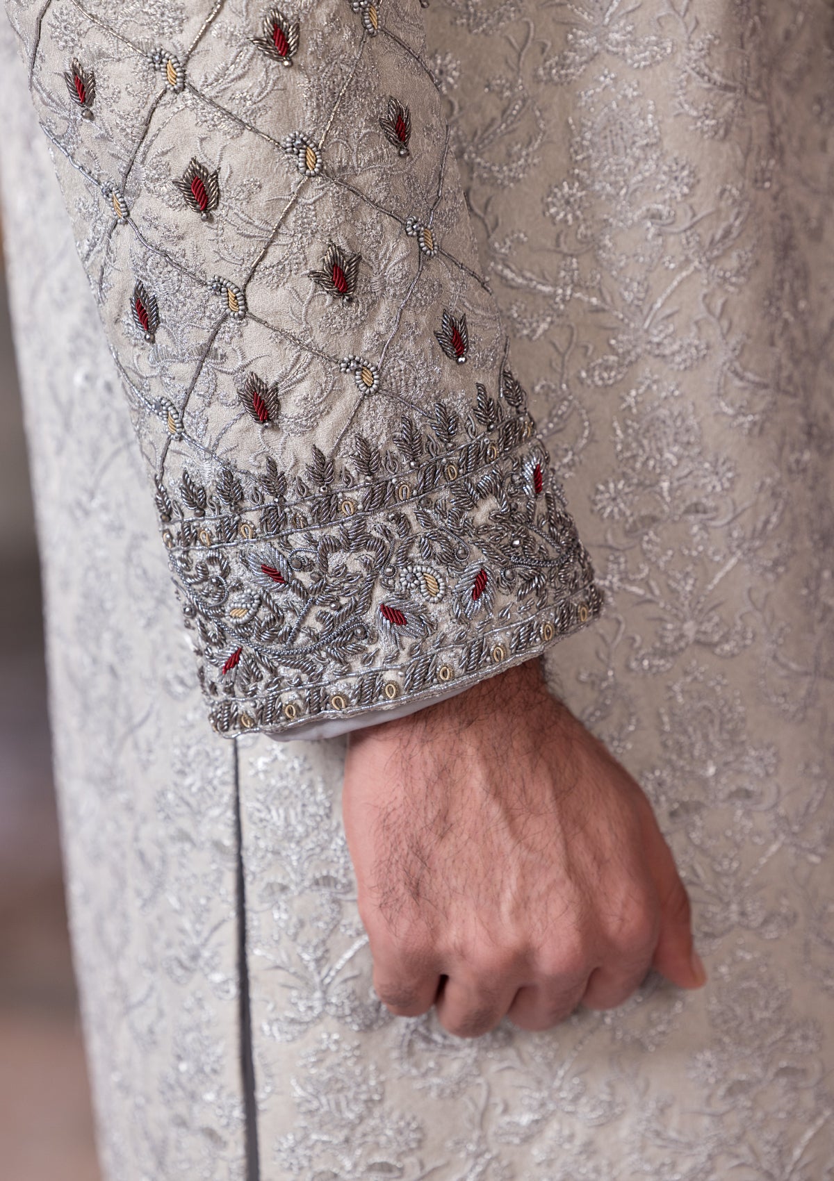 HAND EMBROIDERED SHERWANI , EMBROIDERED FABRIC ,DIFFERENT TONES OF SILK THREAD & CLASSIC EMBROIDERY TECHNIQUES