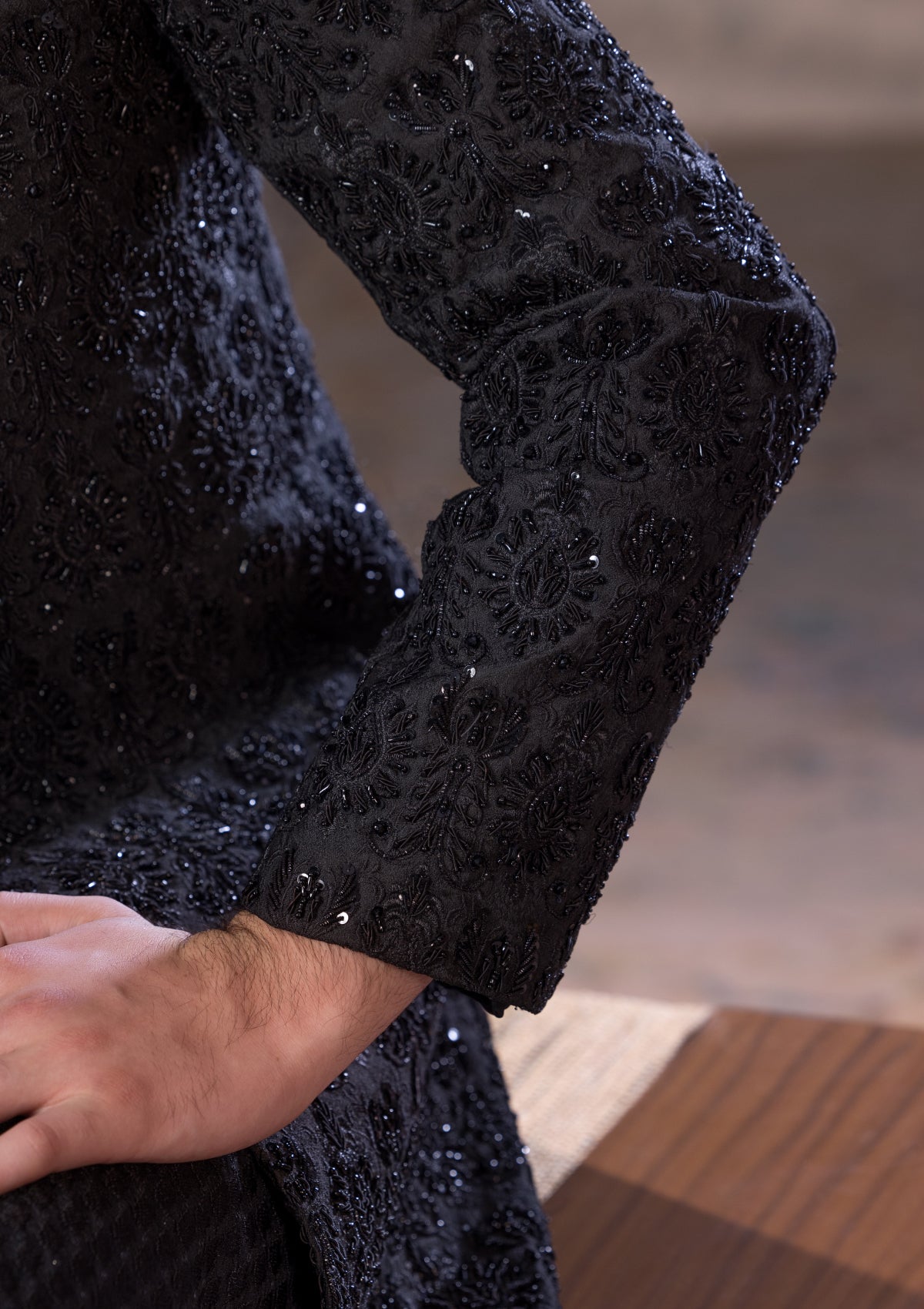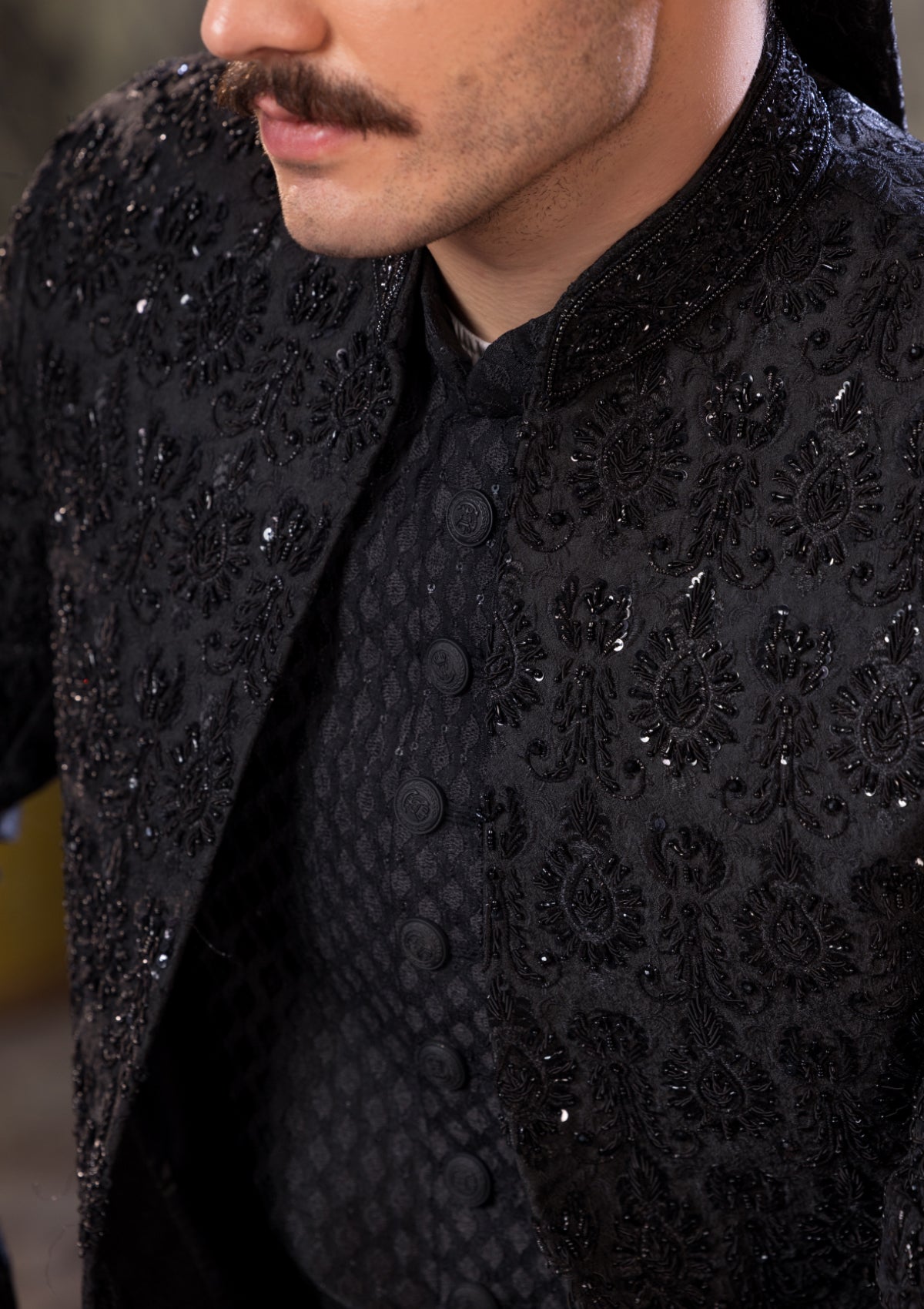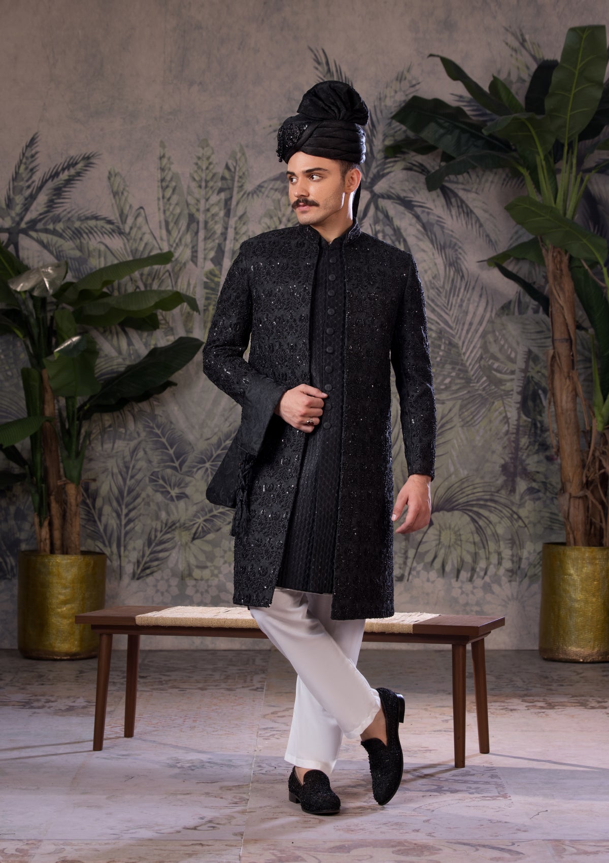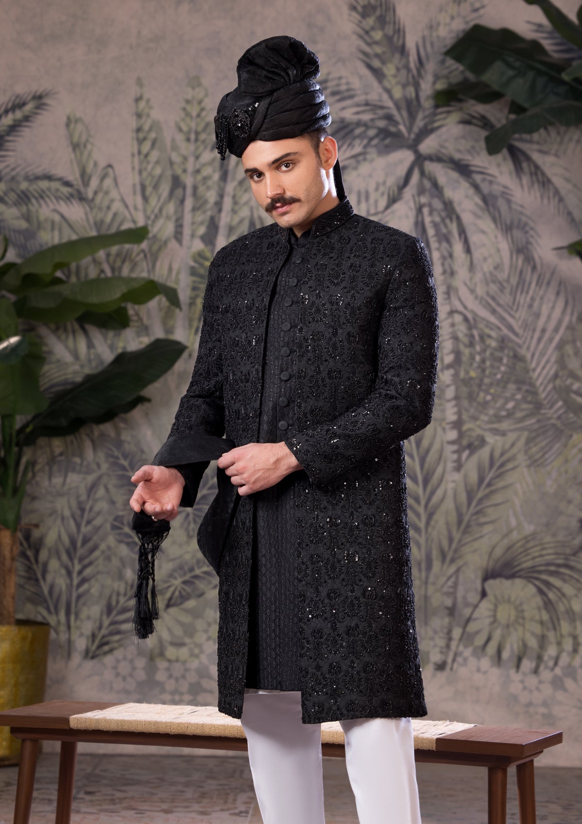 HAND EMBROIDERED SHERWANI , EMBROIDERED FABRIC ,DIFFERENT TONES OF SILK THREAD & CLASSIC EMBROIDERY TECHNIQUES INCLUDED QULLA KHUSSA & MALLA IN THIS PRICE
