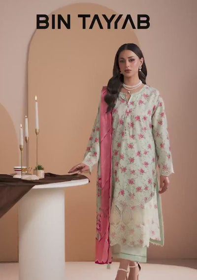 Bin Tayyab ki exclusive Zarqash Collection se yeh khubsurat Pret 3 Piece Printed Chickenkari Lawn Suit aap ke summer wardrobe ke liye perfect choice hai. Is outfit ka soft mint green base delicate pink floral print aur elegant chickenkari inspired detailing ke sath design kiya gaya hai, jo aap ko ek graceful aur sophisticated look deta hai.